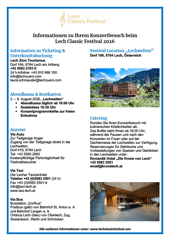 Das Lech Classic Festival entfacht 2026 erneut ein musikalisches Feuerwerk: An sieben glanzvollen Konzerttagen entfaltet sich ein facettenreiches Programm mit international renommierten Vokal- und InstrumentalsolistInnen. Begleitet werden sie vom Lech Festival Orchester – einer hochkarätigen Formation junger Spitzenmusiker aus führenden mitteleuropäischen Orchestern.