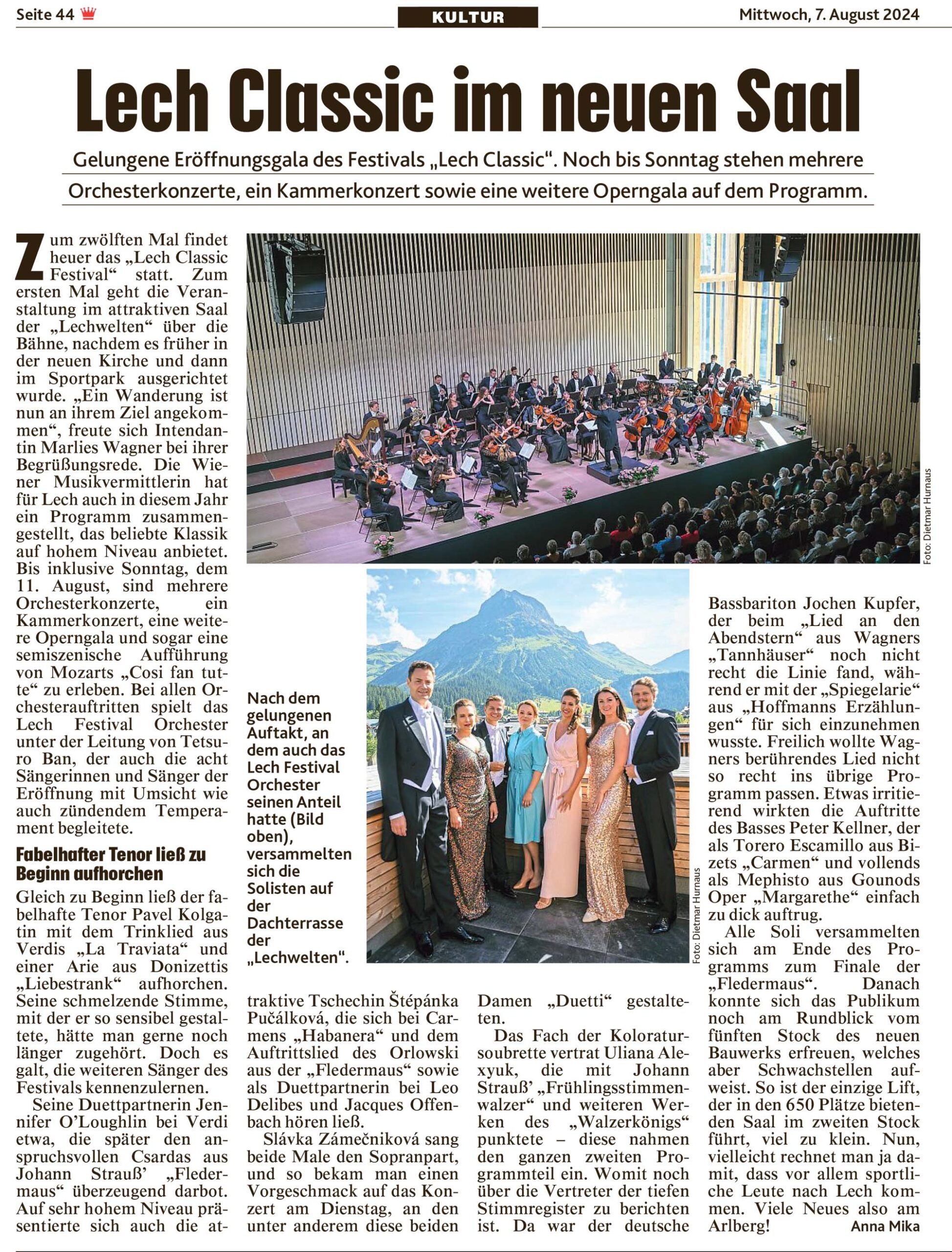 Presse 2025 Große Oper am Arlberg – Kronen Zeitung von 11.8.2025 Musik als Landschaft der Seele – Vorarlberger Nachrichten von 8.8.2025 Klassik in der Bergwelt – Kronen Zeitung von 2.8.2025 Musikalische Gipfeltreffen am Arlberg– Vorarlberger Nachrichten von 14.7.2025 2024 „So machen es alle“ am Arlberg – Vorarlberger Nachrichten von 15.8.2024 „Cosi fan tutte“ überzeugte vollauf – Kronen Zeitung von 14.8.2024 Ein Premierenempfang mit Panoramablick – Kronen Zeitung von 9.8.2024 Lech Classic im neuen Saal – Kronen Zeitung von 7.8.2024 Eröffnungsgala – Vorarlberger Nachrichten von 7.8. 2024 Empfang und Gala in den Lechwelten – Vorarlberger Nachrichten von 7.8. 2024 Vorarlberger Nachrichten von 4. 7. 2024 Kinder Zauberflöte – Kronezeitung von 22. 6. 2024 Kinder Zauberflöte – Vorarlberger Nachrichten von 19. 6. 2024
